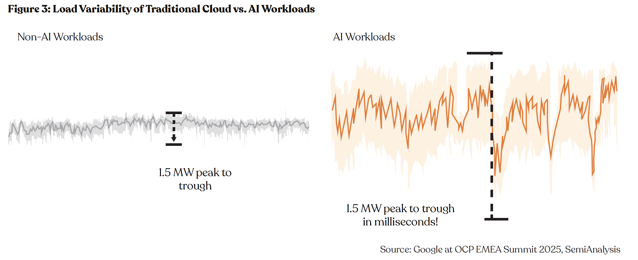 Unlike traditional cloud workloads, which have relatively steady and predictable loads, AI training workloads create extreme, instantaneous fluctuations in power draw. Tens of thousands of GPUs can surge from near-idle to full capacity, or drop back again, in fractions of a second. This can happen when GPUs pause for checkpointing, synchronize during collective communication, or when a massive training job starts or stops. This leads to sudden swings of tens of megawatts, equivalent to powering or shutting off an entire industrial complex in an instant.